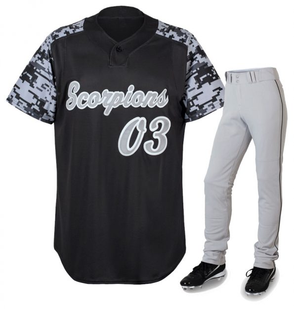 Sports Wear Baseball Uniforms Manufacturer Warp Knit Full Button MVP Jersey. Paired with the 17 oz. Classic Pro Baseball pant featuring traditional fit and elastic hem. Made from the highest quality U.S. Made Materials for increased durability.